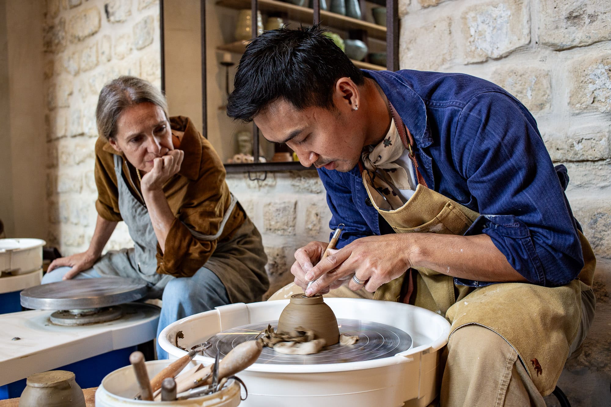 The entire Slow Potter studio is reserved for you. Guided by Chentar, a professional ceramicist, you discover or deepen your wheel-throwing practice together — taking turns, each at your own pace — in a calm and intimate atmosphere.